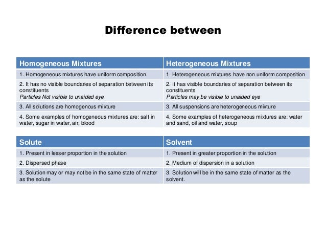 Homogeneous mixture Heterogeneous mixture 1 Uniform composition Nonuniform composition 2 The nondetectable boundary between solute and solventList the points of difference between homogeneous and heterogeneous mixture SOLUTION Q 3 Differentiate between homogeneous and heterogeneous mixtures with examples SOLUTION Refer Ans 2 above Q 4 How are sol, solution and suspension different from each other?Like us on Facebook https//wwwfacebookcom/k12mojoFollow us on twitter https//twittercom/K12MojoDownload our App https//playgooglecom/store/app